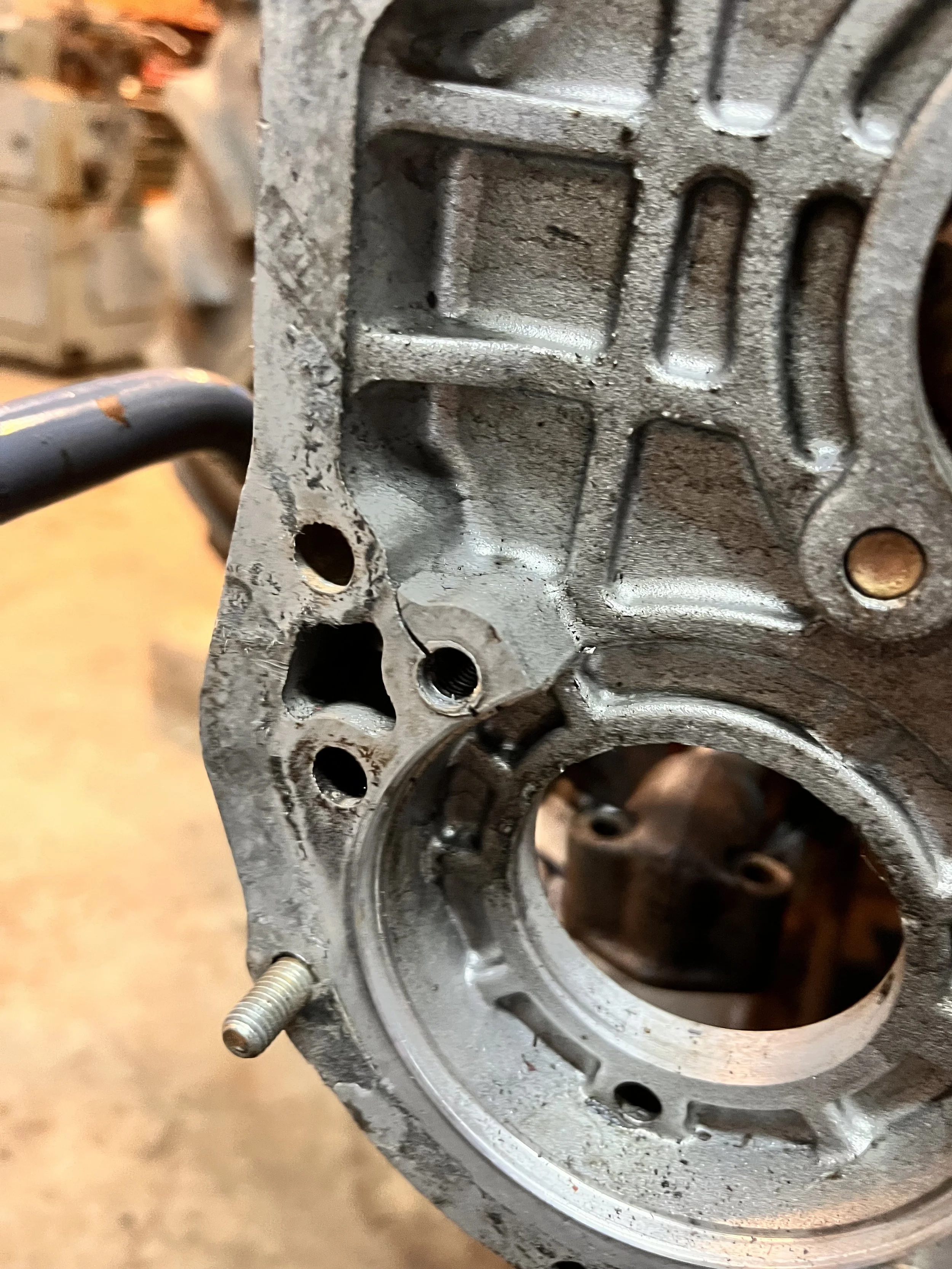 This ongoing project involves the diagnosis and repair of a New Holland TN65 tractor engine and is being completed as time allows. The initial failure was traced to a failed bearing on the pump drive gear, which prompted removal of the front gear cover for inspection. During disassembly, a secondary failure was identified at one of the bolt holes on the rear gear cover, indicating additional structural and alignment concerns beyond the original fault.