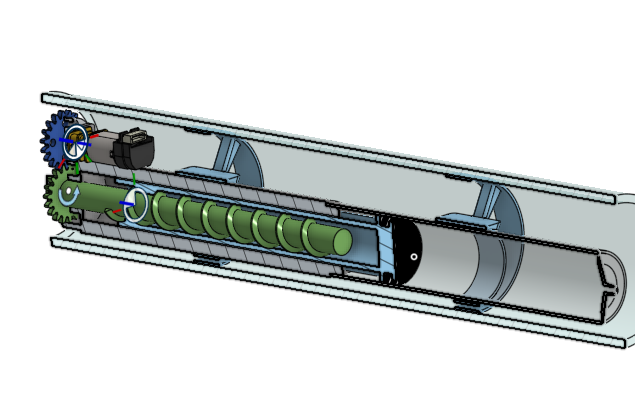 The system is actuated by a 6 V geared DC motor coupled to a gear train, which drives a central shaft responsible for regulating water intake into the ballast chamber. Controlling ballast volume, the mechanism enables precise buoyancy adjustment and vertical positioning in an aquatic environment.