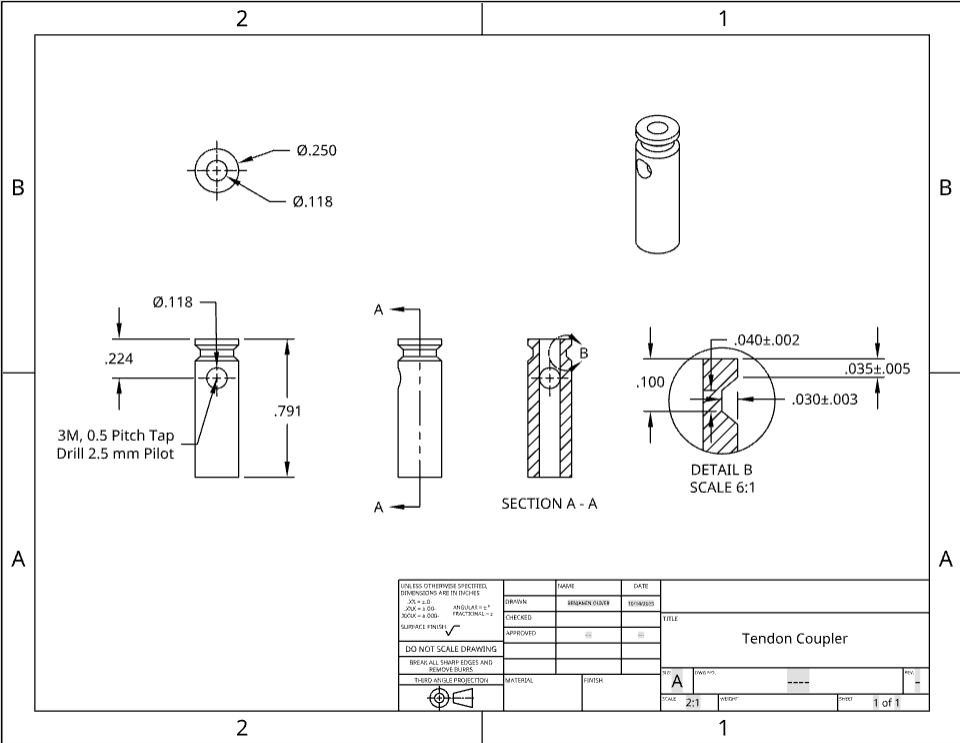 Designed a compact DC motor coupling utilizing aluminum tubing and a custom 3D-printed PLA sealing washer. The design provides a watertight interface between the motor mount and electronic enclosure while maintaining precise shaft alignment. All components were fully dimensioned and toleranced per ASME Y14.5.